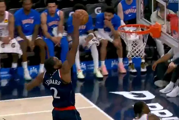 第三节比赛中,伦纳德抢断反击单臂滑翔劈扣拿19分,快船追至落后雷霆20分。